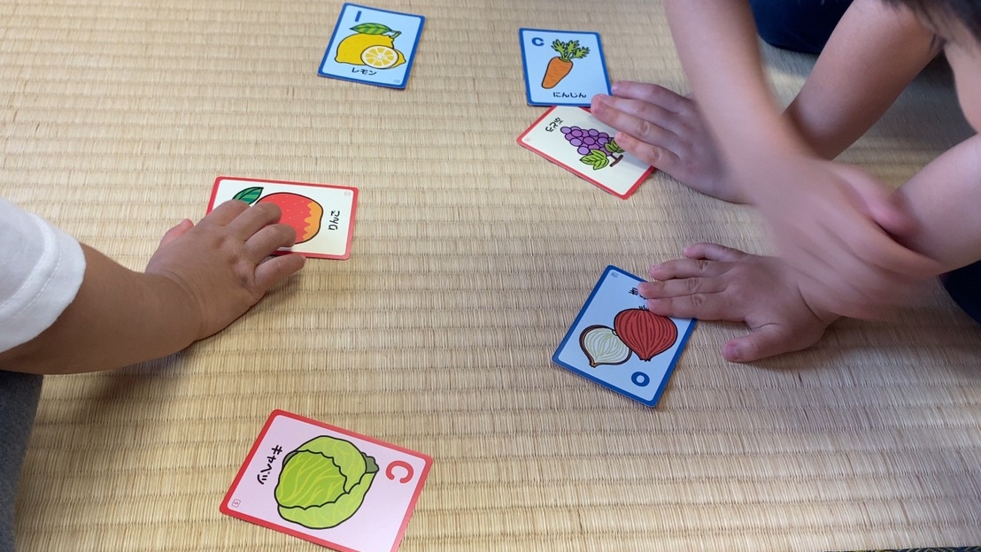 英語かるたでは、「野菜」や「動物」などのテーマごとに勝負をしました。